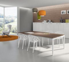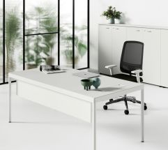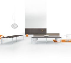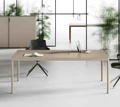 Scrivanie dall’impiego trasversale per uffici direzionali, operativi e sale riunioni. Il telaio perimetrale in alluminio, il piano incassato a filo, gli spigoli arrotondati definiscono un nuovo stile.